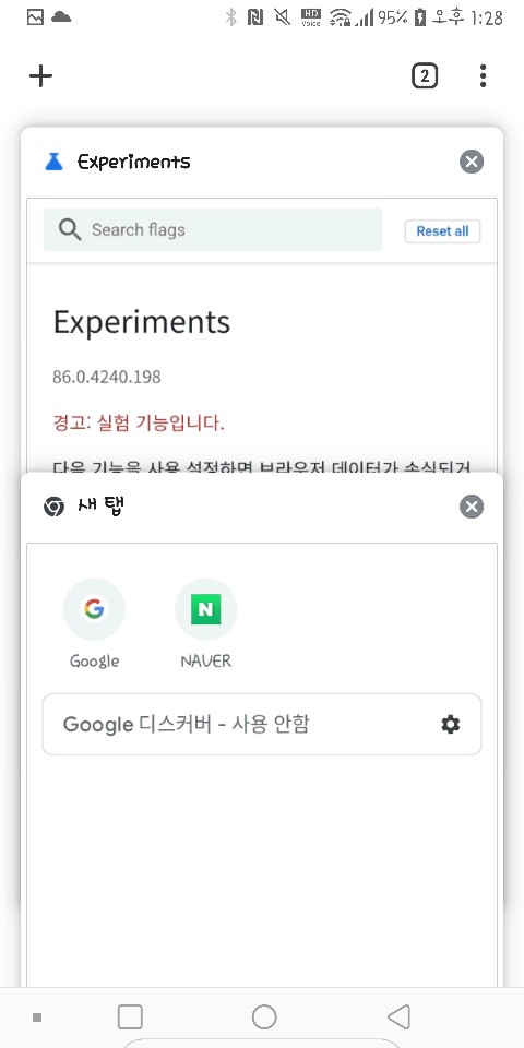 라고 치면 크롬 브라우저 flags 설정 페이지가 열리게 된다. 빨간색으로 경고가 되어 있고, "데이터가 손실되거나 보안이 악화되거나 개인정보가 유출될 수도 있습니다." 라고 적혀있다.
